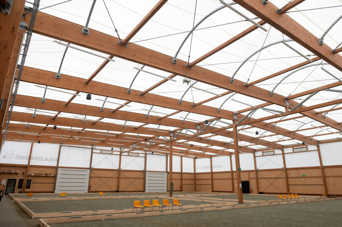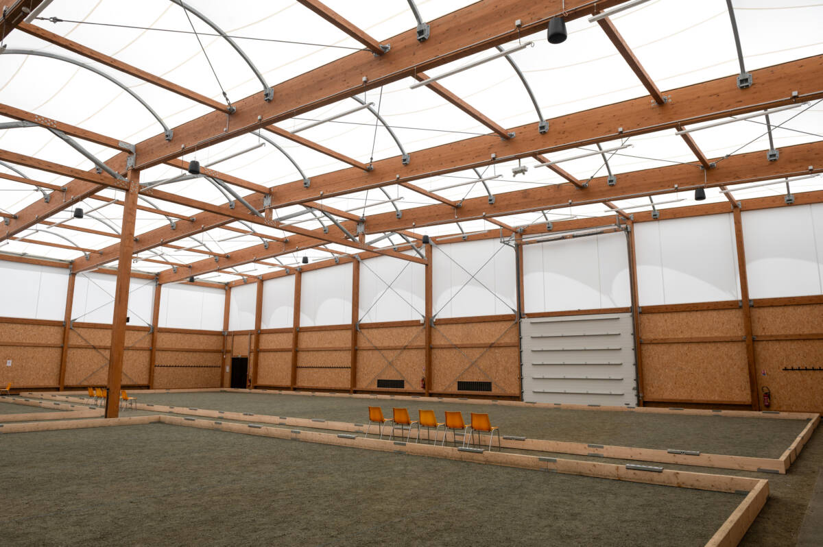 The translucent canvas allows pétanque to be played sheltered from the elements, while 500Lux LED lighting is provided for late-night games. The installation of double and sectional doors allows the building to be opened up to the maximum, so that the outside can also be enjoyed.