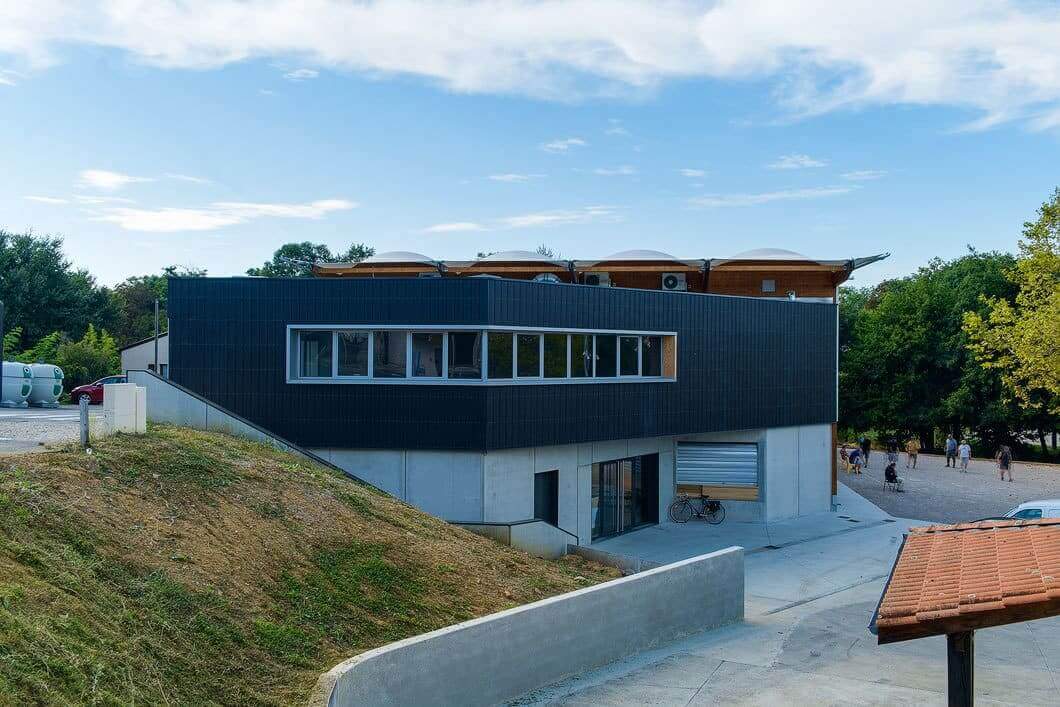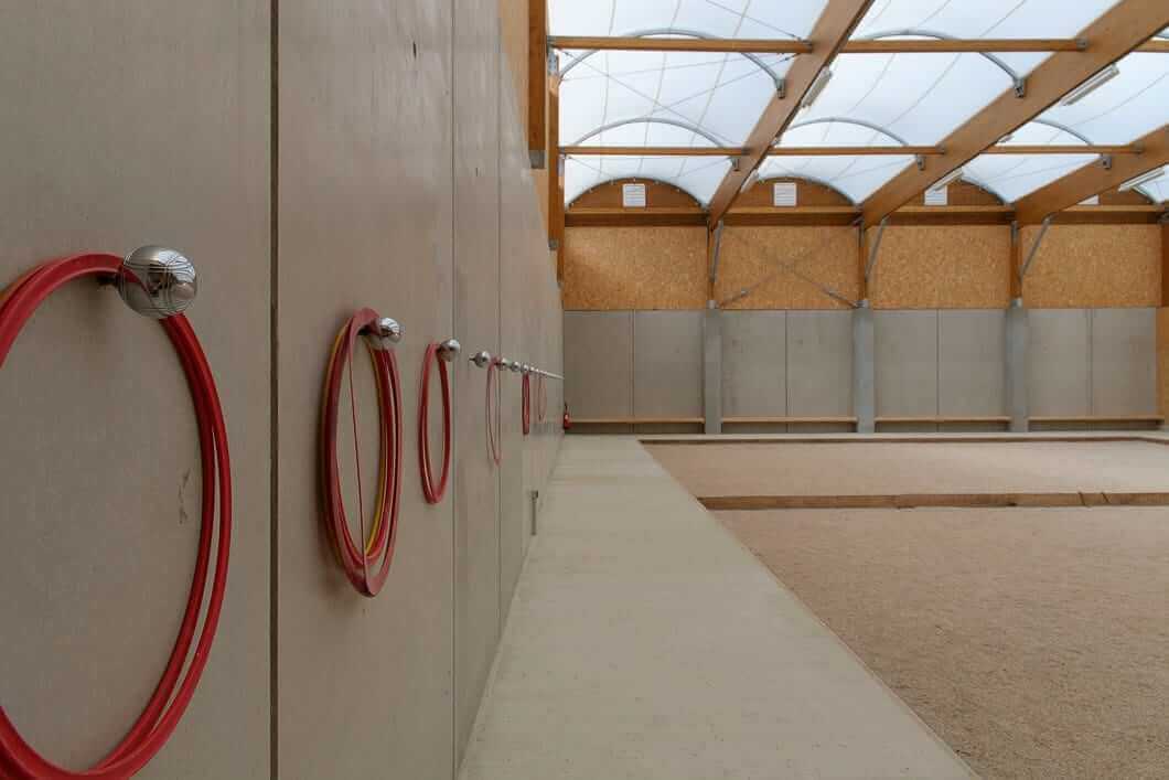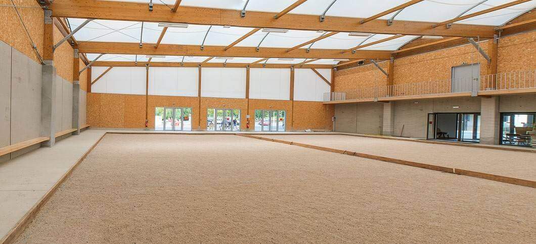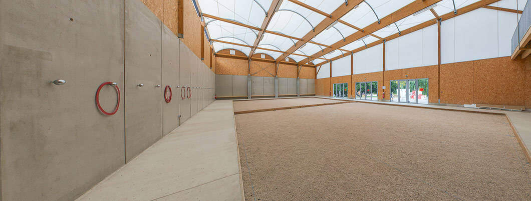 Construction of a timber frame bowls pitch with a glue-laminated timber frame mounted on a textile membrane.