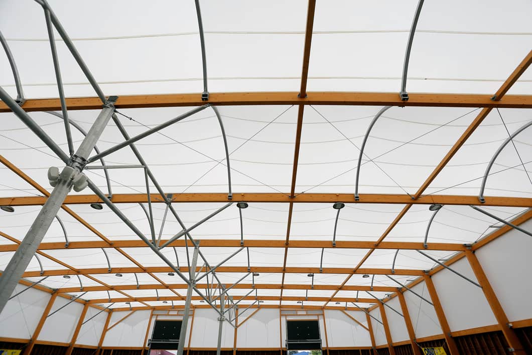 Construction of a bowls pitch, covered by a translucent textile membrane stretched over a mixed glue-laminated timber and galvanized steel structure.
