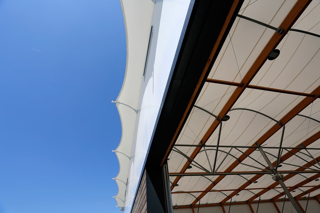 Peripheral wood cladding. Textile membrane facade.