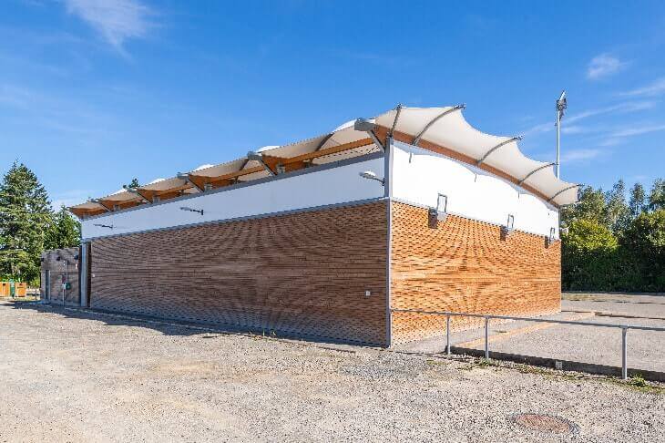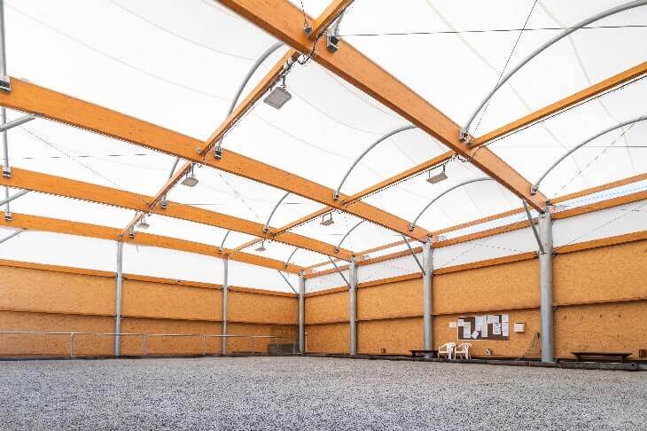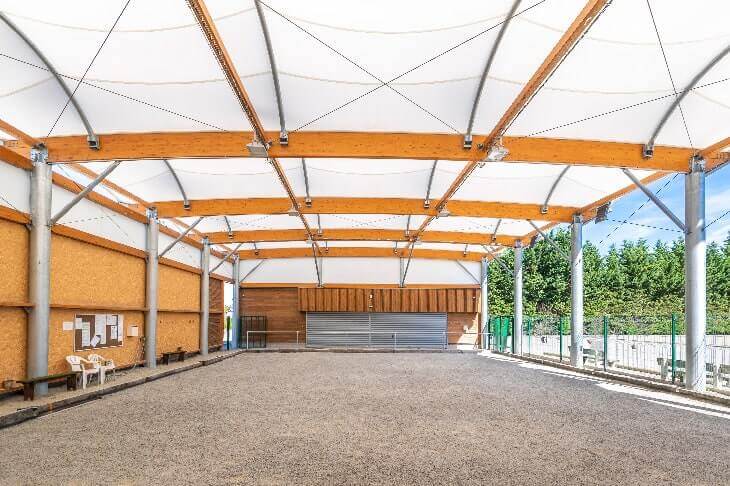 Construction of an open air bowls pitch covered by a textile membrane stretched over a mixed glue-laminated timber and galvanised steel frame.