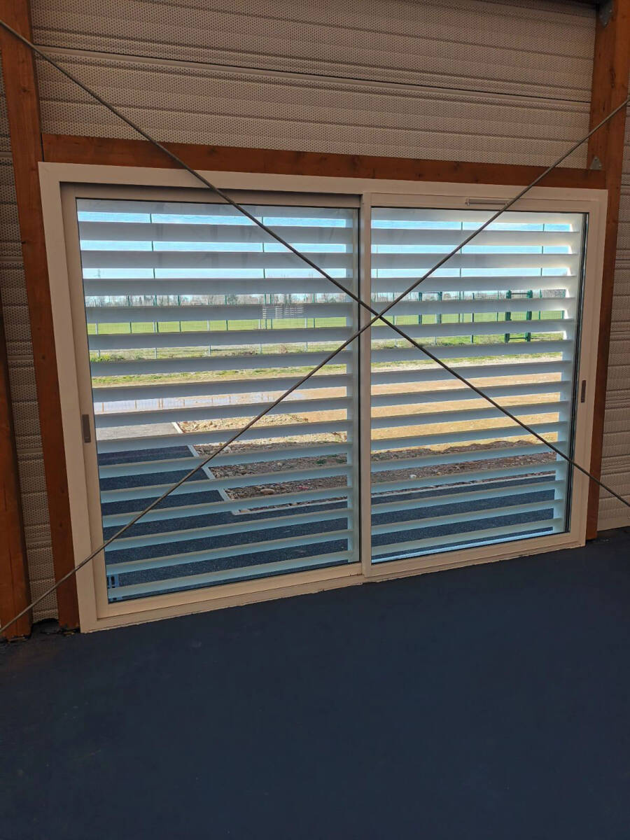 The upper façades are clad in monochrome screen-printed tensioned fabric, giving the building a distinctive architectural identity while preserving natural ventilation. The lower part of the building is covered with double-skin cladding, providing enhanced insulation and optimal protection against external impacts.