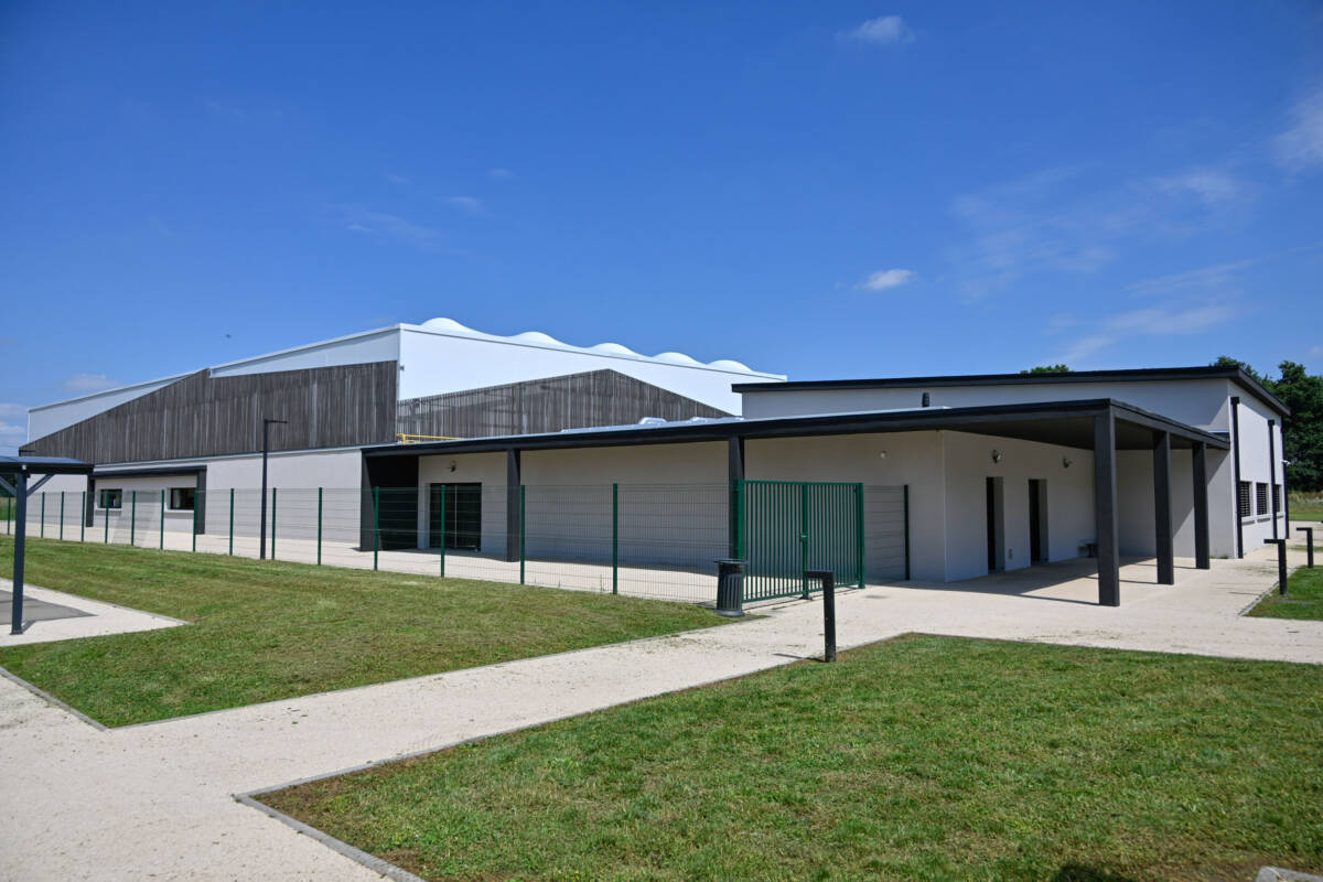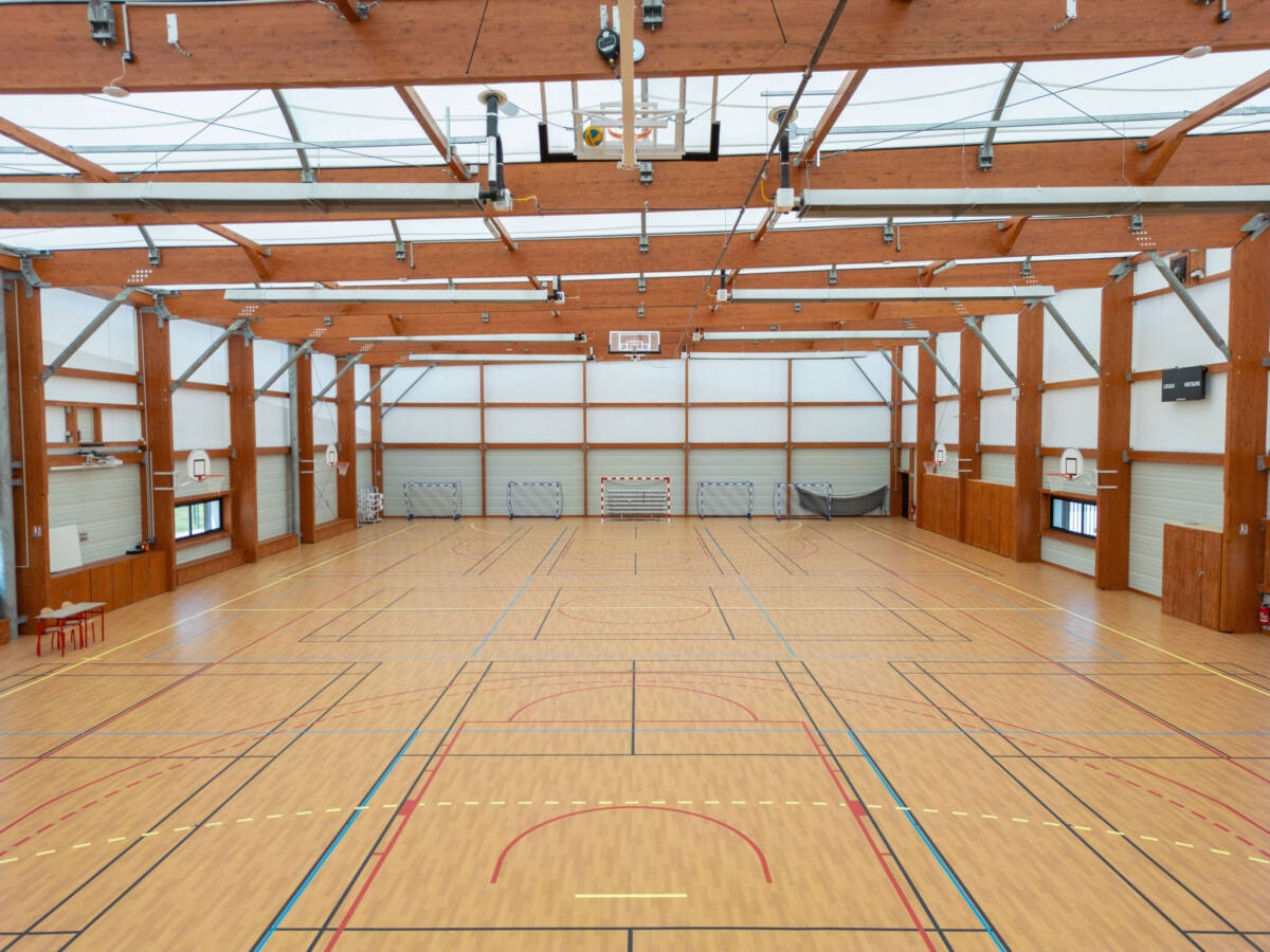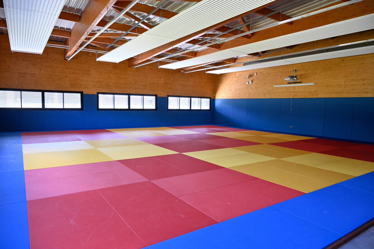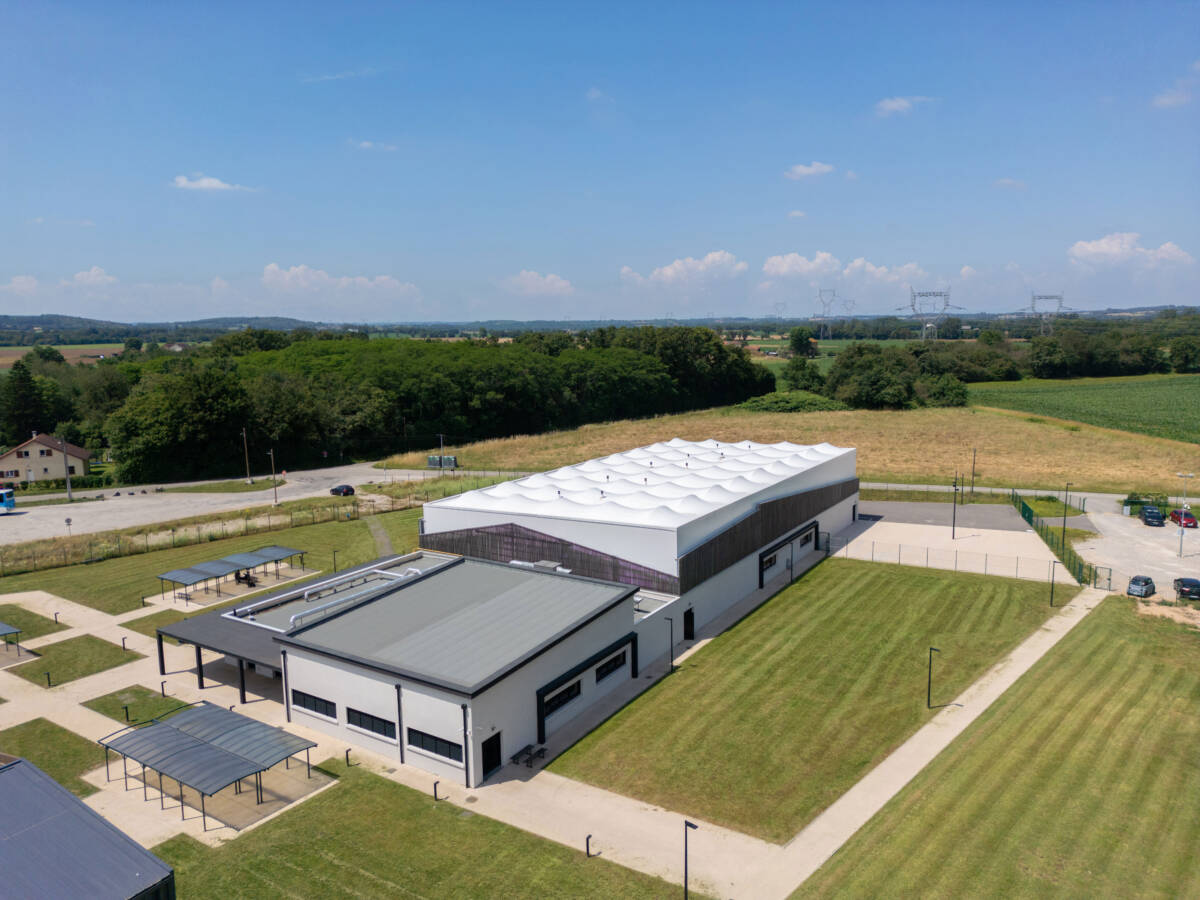 Construction of a 1,757 m² gymnasium and dojo with changing rooms, covered by a textile membrane mounted on a mixed glulam timber and galvanized steel framework.