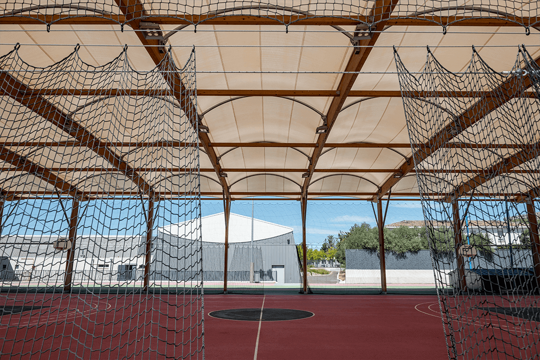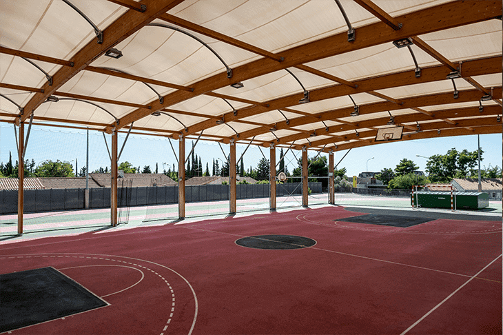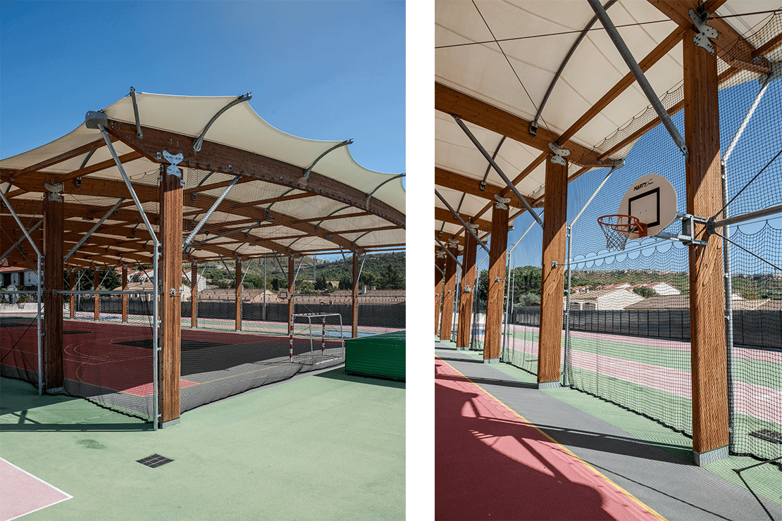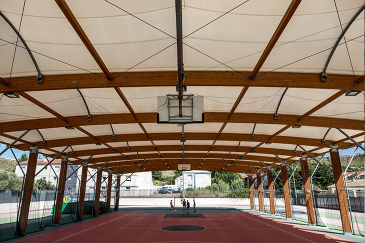 Design construction of a multi-sports platform covered by a courtyard in wood and steel construction and textile membrane cover.