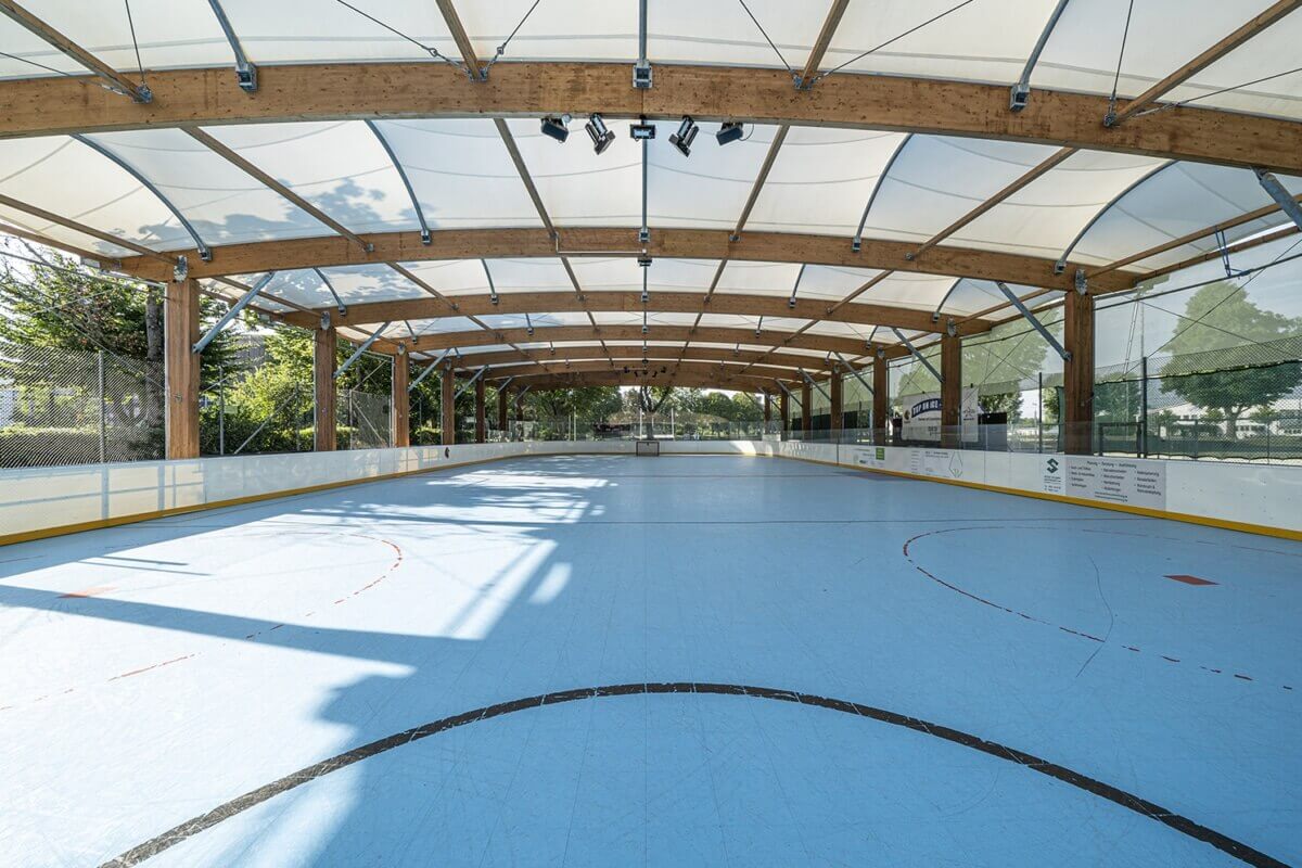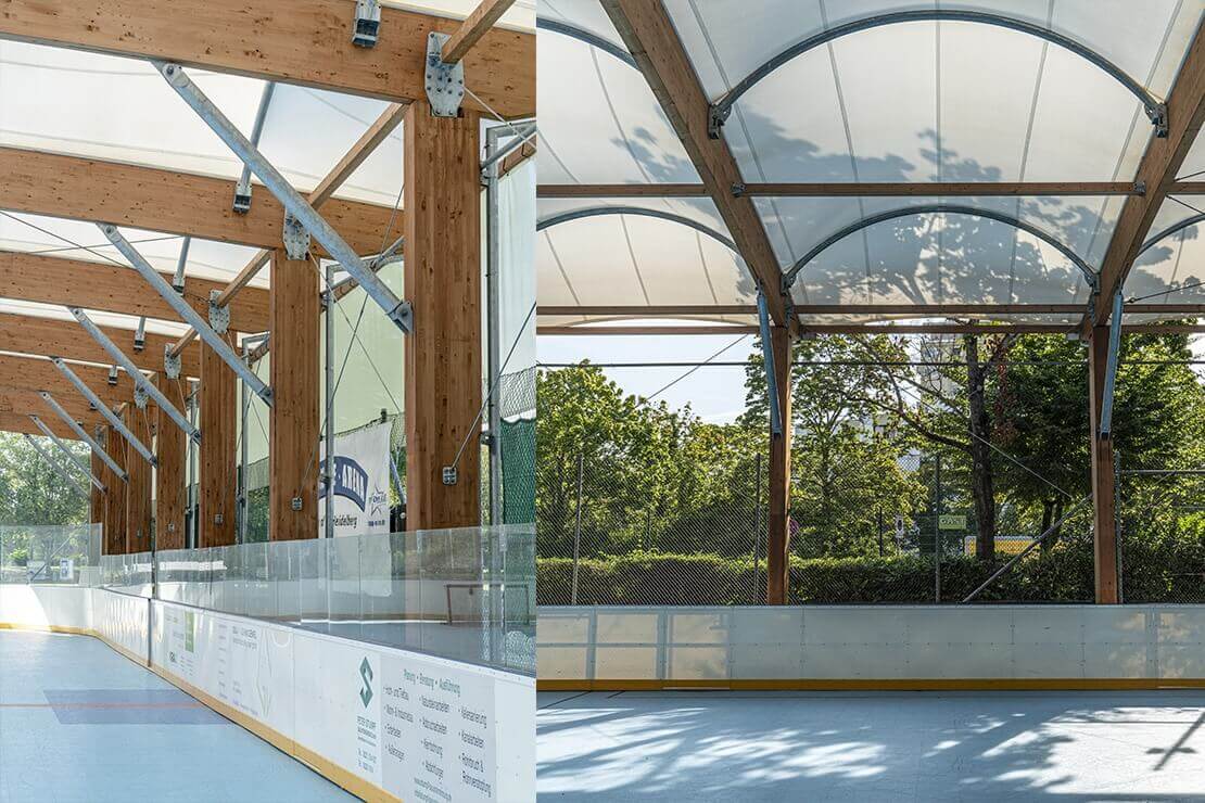 Construction of a hockey field covered by a courtyard with a wooden frame and textile membrane cover.