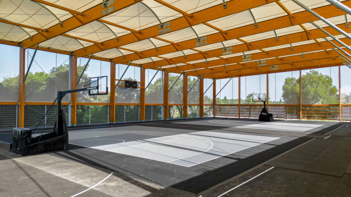 The sports canopy, fitted with customizable Powergame tiles, offers full personalization options, along with scoreboards and movable sports equipment.
