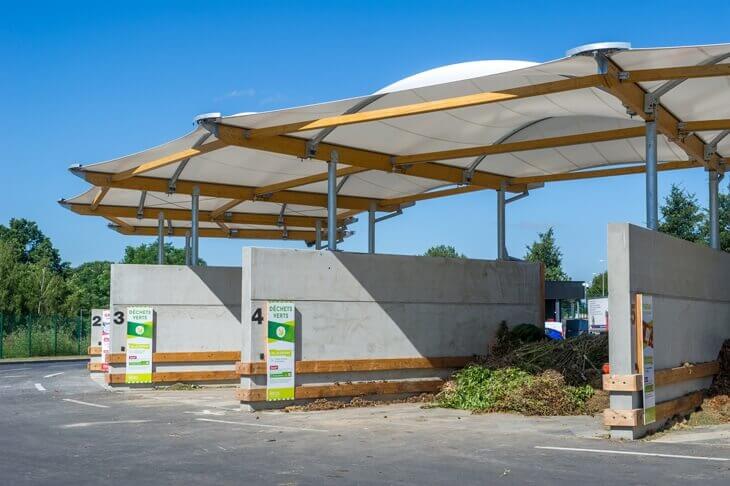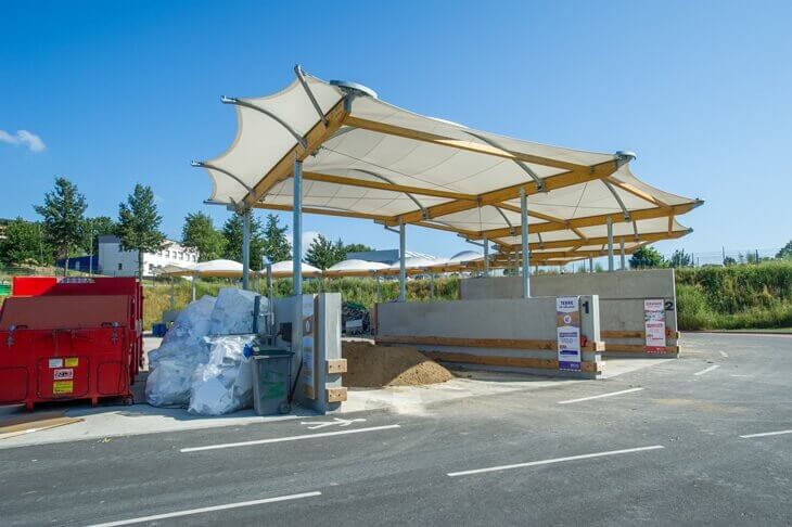 Construction of a cover for recycling center with installation of a textile membrane mounted on a mixed glulam and galvanized steel frame.