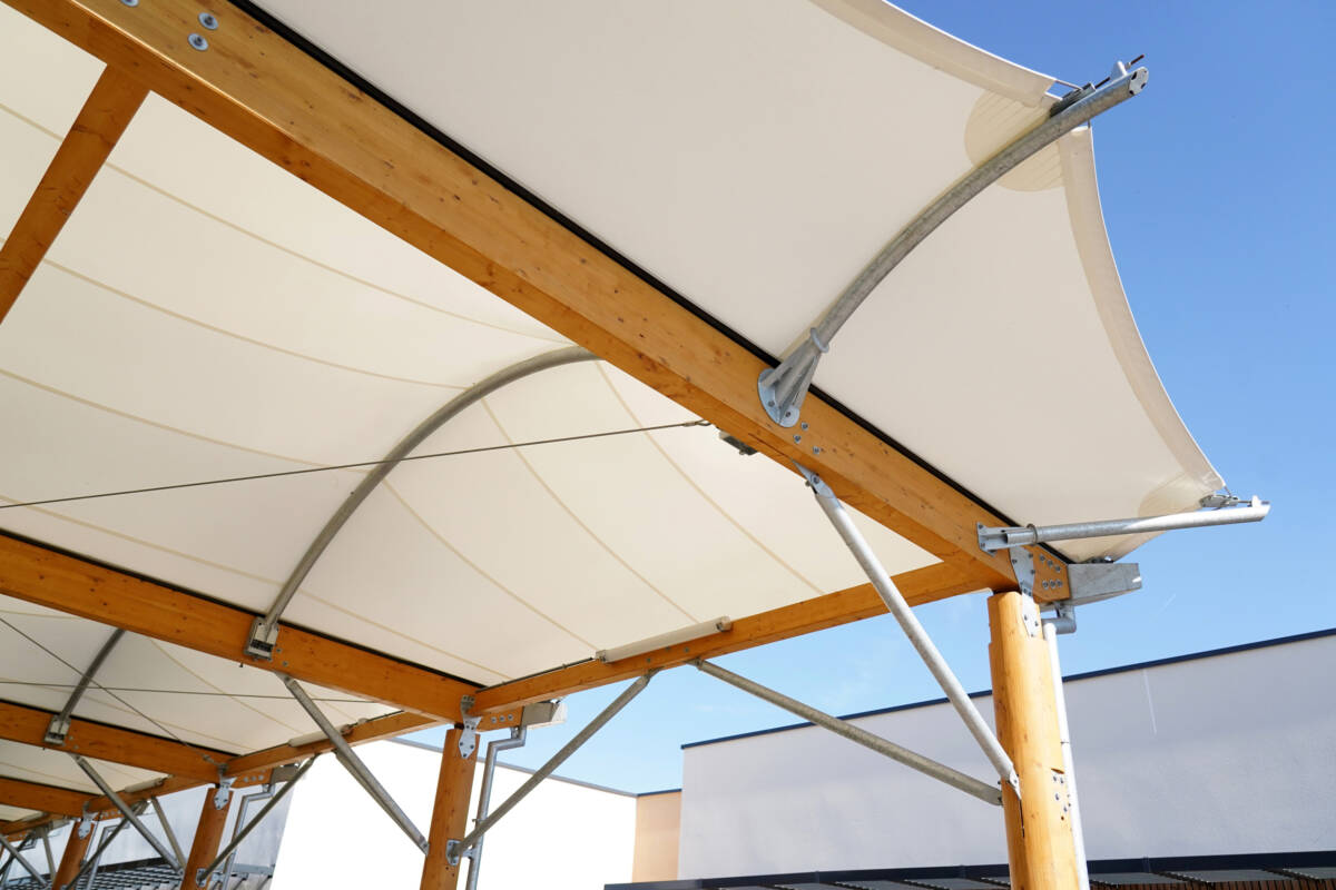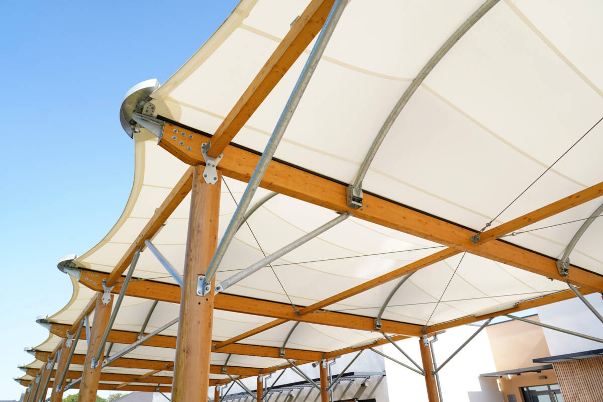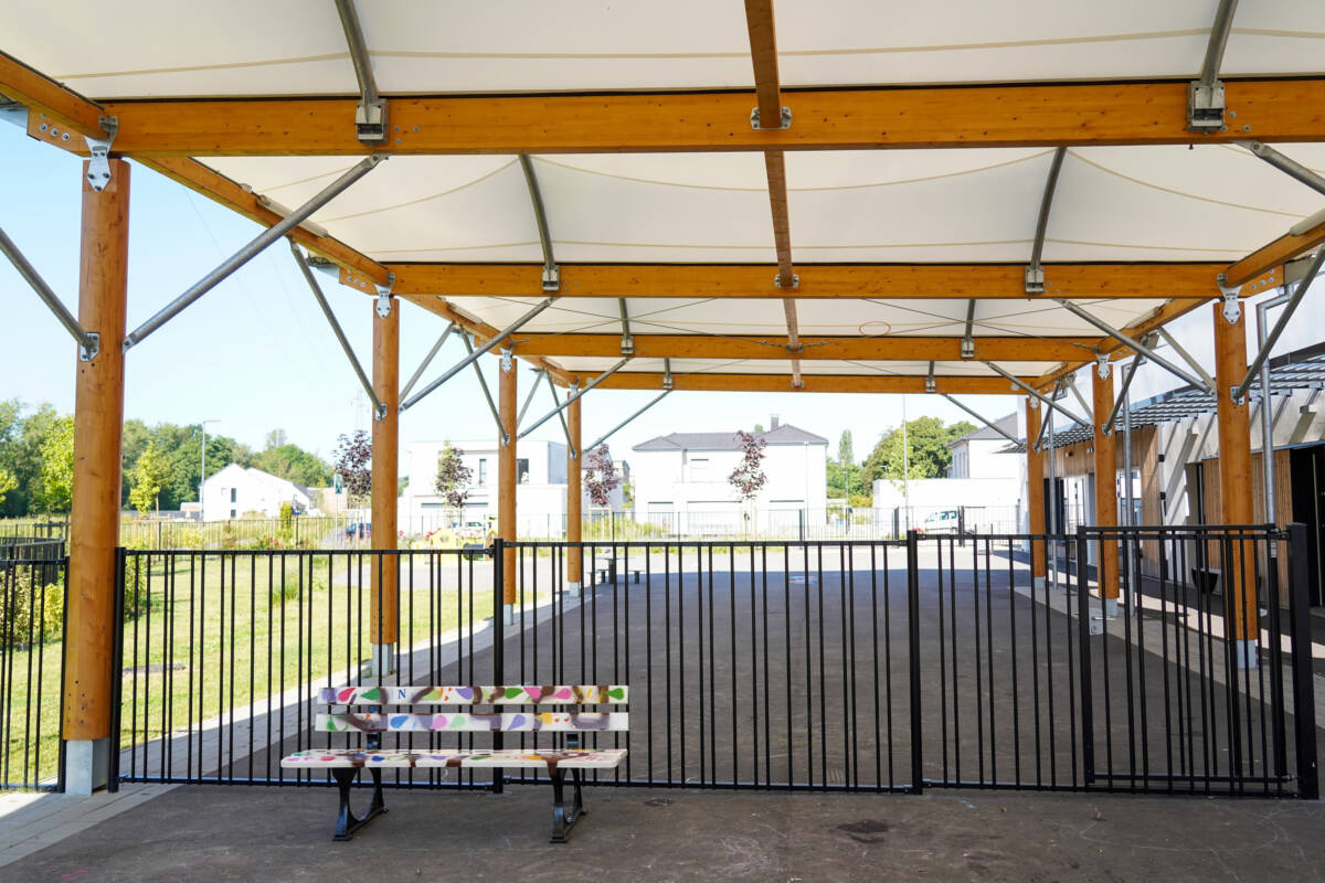 The 335 m²/3606 Ft2 canopy was designed to blend harmoniously into the architecture of the school complex.