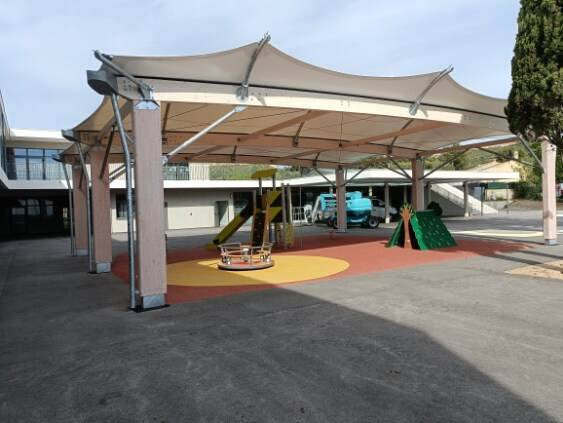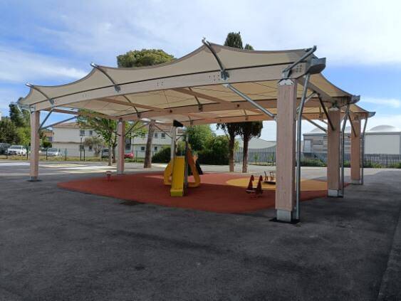 The city of Rognac continues its commitment to children’s well-being by installing a new school canopy to cover a playground area. This modern structure, made of a tensioned fabric stretched over a mixed frame, provides a safe play space that meets students’ needs while blending harmoniously into the school environment.