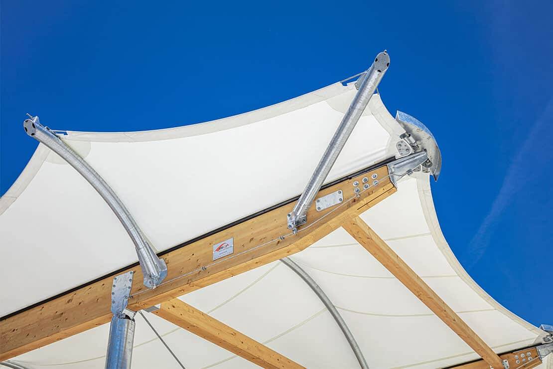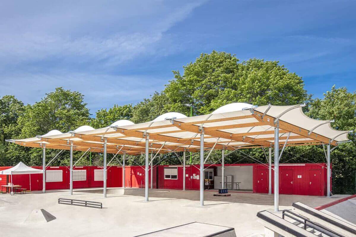 To ensure that skateboarding can be practised all year round and at all times, SMC2 designed and built a sports hall to protect the skatepark. It was built with a wooden frame and a textile membrane cover.
