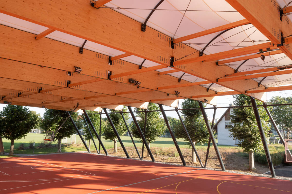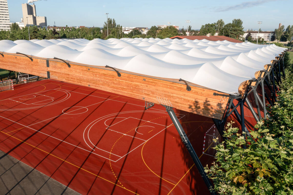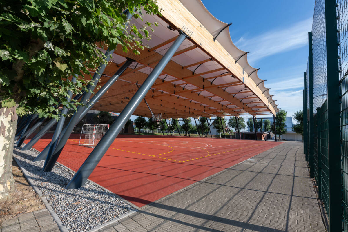 The sports floor and landscaping were already in place. The courtyard was designed to preserve them, that’s why the posts are angled towards the inside of the building.