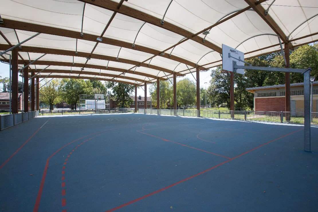 Basketball court covered by a textile membrane stretched over a mixed glue-laminated timber and galvanized steel structure.