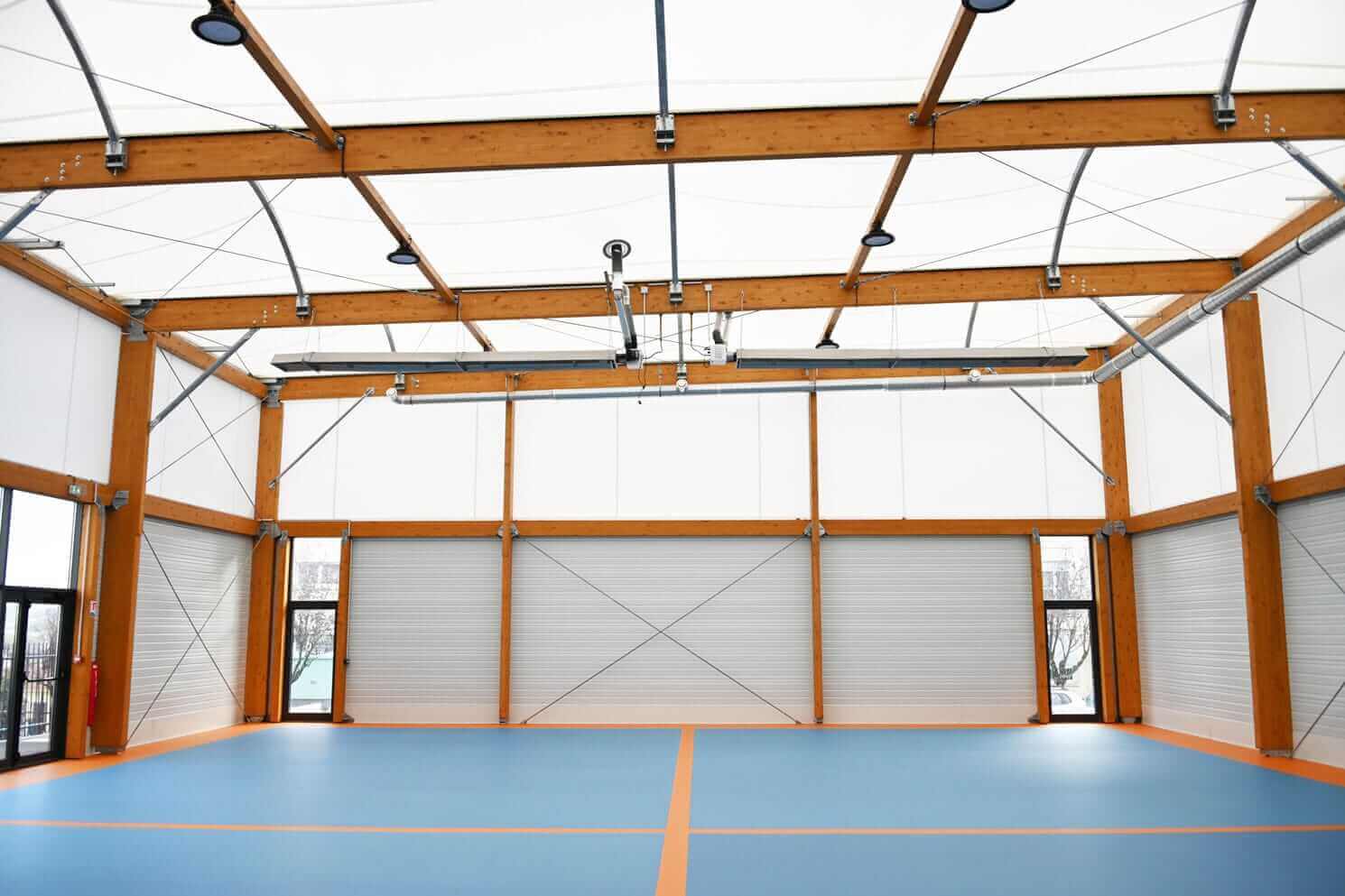 The building was built with a mixed wood/steel frame. The roofing is made of a textile membrane, as are the upper façades. The gymnasium thus benefits from optimal natural light. The interior facades are made of double-skin metal cladding. The cladding is perforated with insulation for better acoustics.