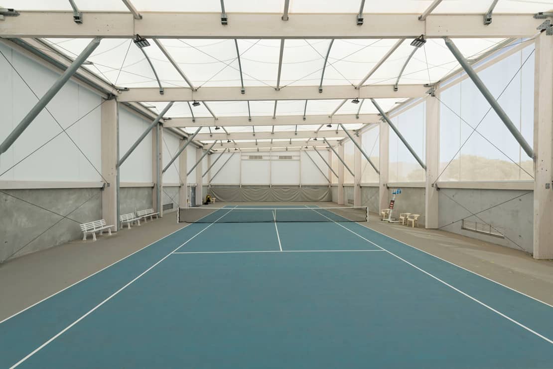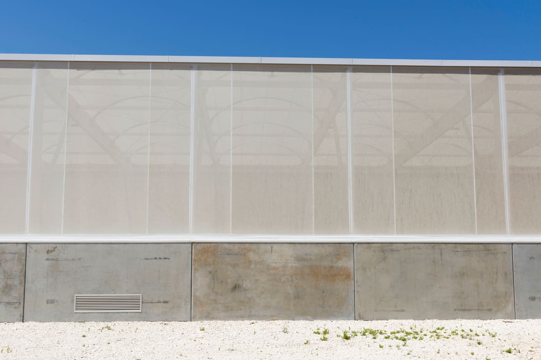 Structure covered by a textile membrane surmounting a mixed frame of glued laminated wood and galvanized steel. Facade on gable and long pan