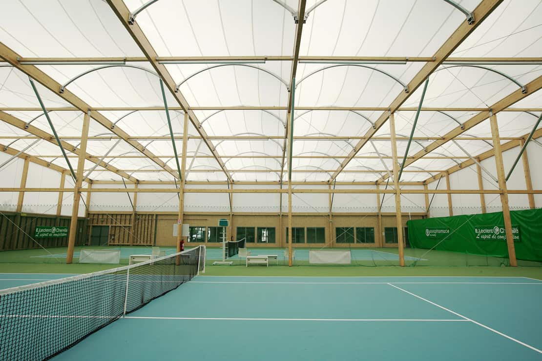 Hall of 3 tennis courts covered by a textile membrane covered by a mixed glue-laminated timber and steel structure.