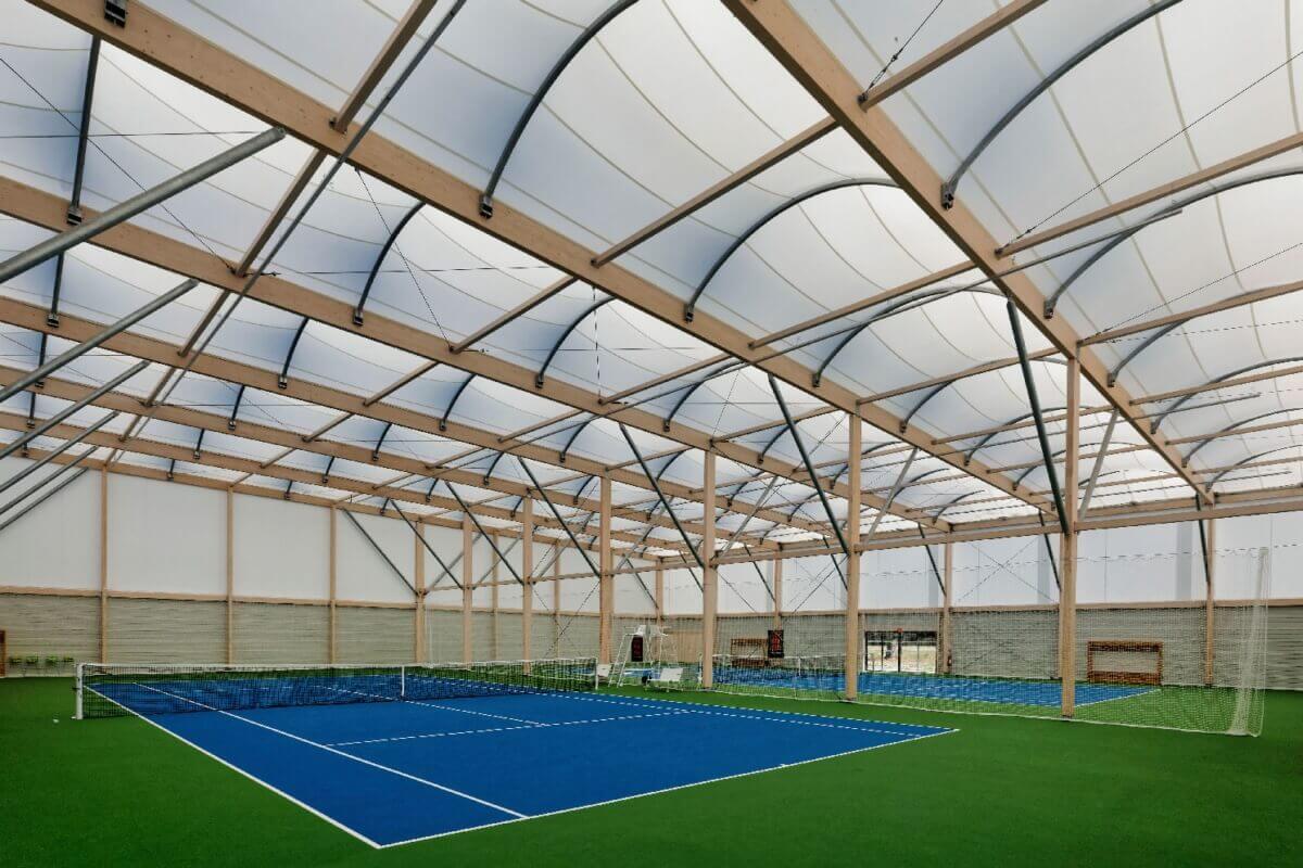 Construction of a hall with two tennis courts, covered by a textile membrane surmounting a mixed laminated wood and galvanized steel frame.