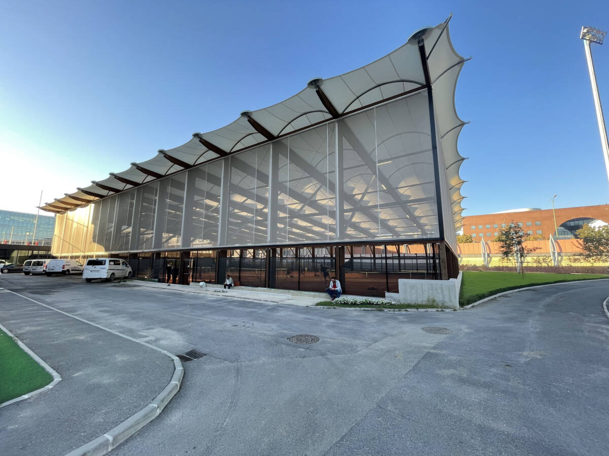 SMC2 has built a 24 563ft covered tennis hall on a mixed timber and steel structure. The high facades are made of screen-printed micro-perforated fabric, and the building is secured by fencing.
